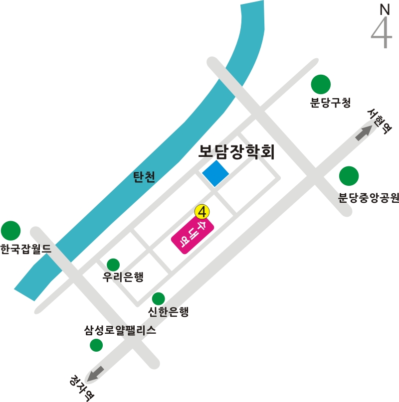 Map 오시는 길 교통_ 분당선 수내역 4번 출구 > 도로 3분 거리 전화_ 031-719-1500 주소_ 경기도 성남시 분당구 황새울로240번길3, 현대오피스 1207호 보담장학재단
